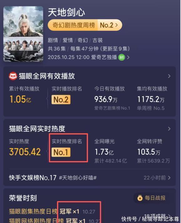 10月25号中午12点,《天地剑心》一上线就炸了锅。 爱奇艺热度半天冲过7000,第二天直接飙到8500,刷新平台纪录。